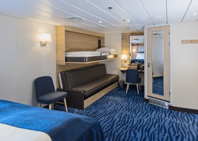 | Q3 - Expedition Mini Suite 16-17 m². Neotvárateľné okno. TV, sejf, minibar, kávovar, varná kanvica. 4. paluba. Max 3 osoby. Výhody Suite. | 13 412 € 6 706 € za osobu | ||