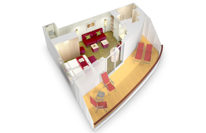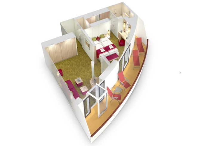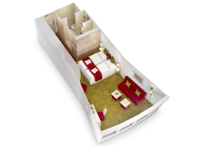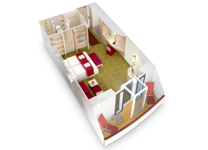 BP - Kajuta s balkónom Panorama PREMIUM 21,5 m² / balkón 4,5 m². Max 3 osoby. Cenový model Premium + výhody Suite. 3 500 € 1 750 € za osobu