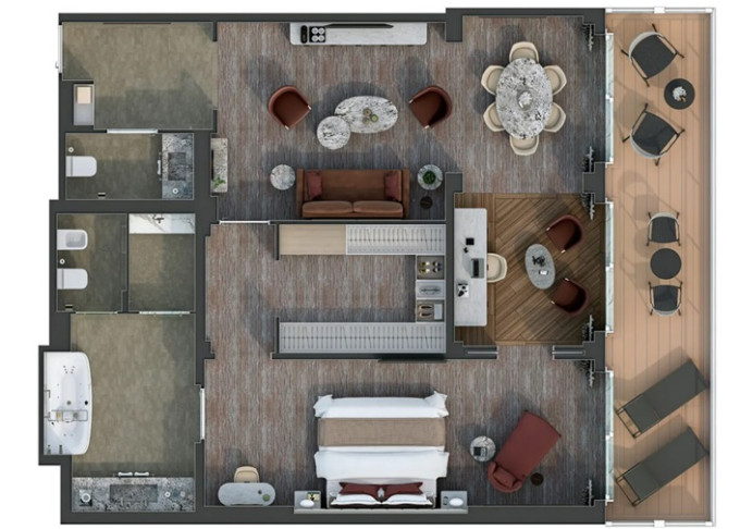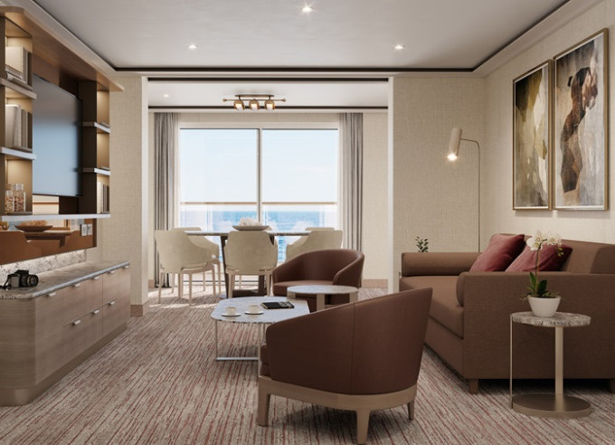 SL - Silver Suite 1 spálňa 63 m² - 2 spálne 96 m² (vrátane balkóna 11-16 m²). 1 alebo 2 spálne, oddelená obývacia a jedálenská časť, kúpeľňa s vírivkou. 6,7,8. paluba, 29 400 € 29 400 € za osobu
